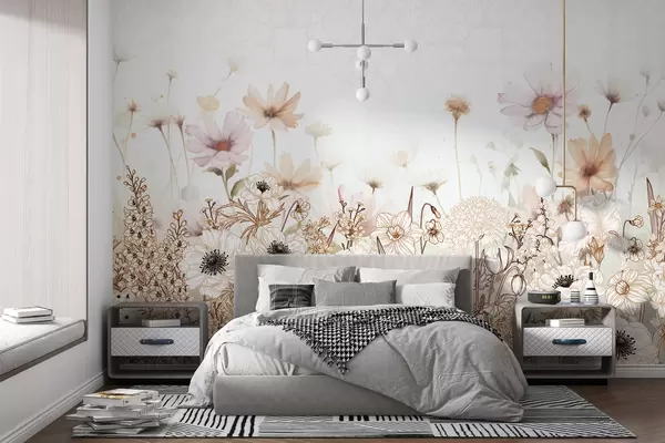 Murais de parede Um campo de flores e folhagens brancas, bege e rosa em um fundo floral suave e desfocado Nr. w08259