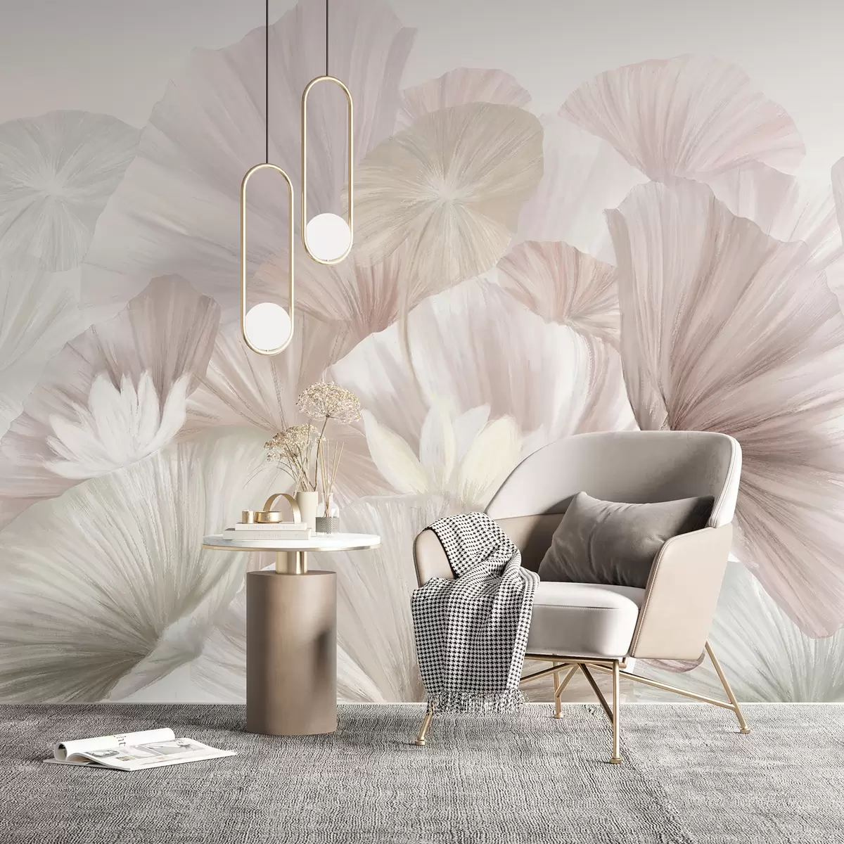 Murais de parede Delicadas folhas de lótus rosa com flores brancas com pétalas macias e emplumadas dispostas em uma composição artística natural Nr. w08265v1