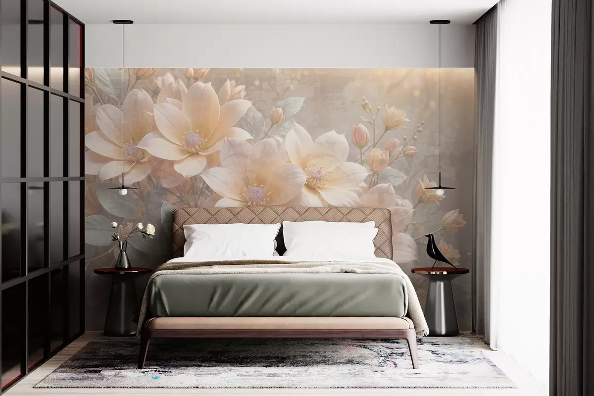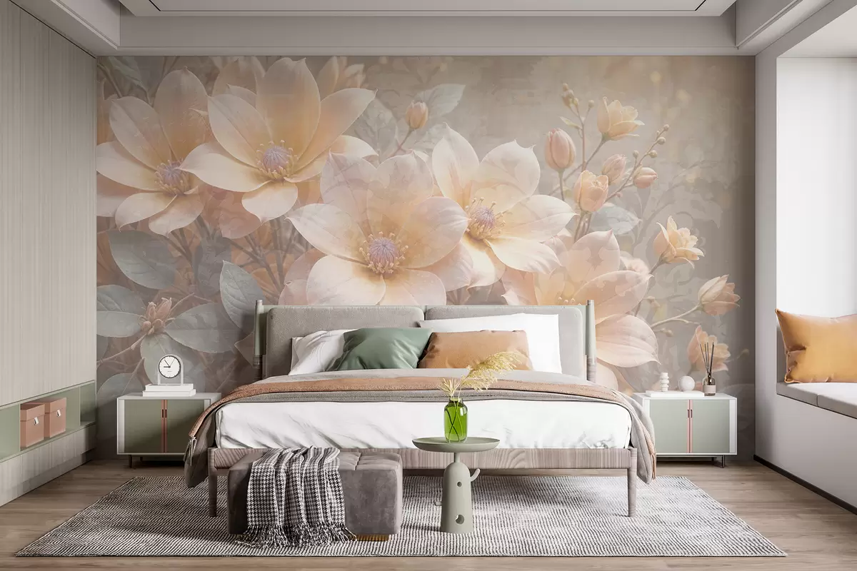Murais de parede Flores em tons pastéis com pétalas delicadas em um fundo texturizado desfocado, criando uma atmosfera serena Nr. w08273