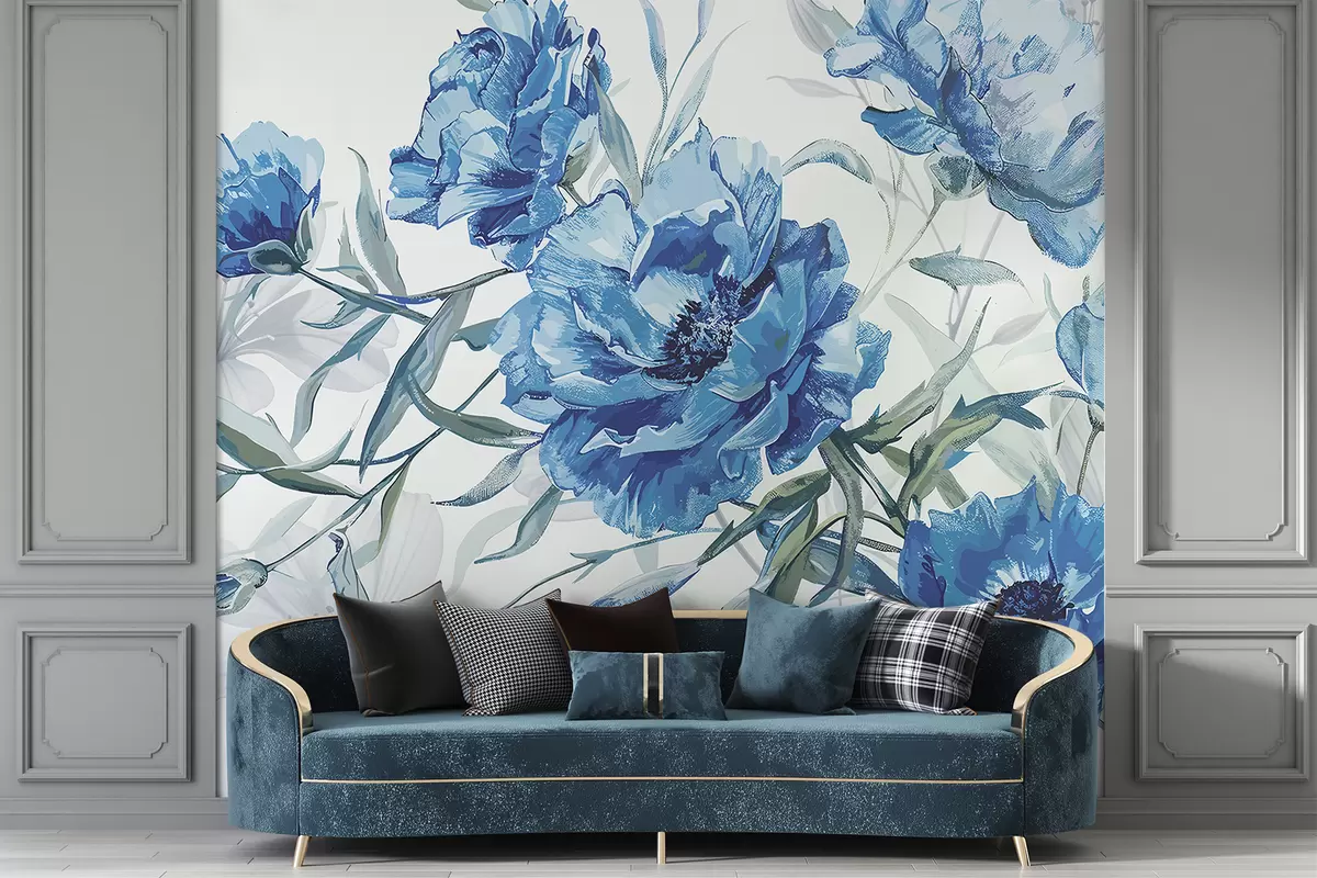 Murais de parede Pintura de peônias azuis com folhagem exuberante contra um fundo abstrato claro Nr. w08274v1