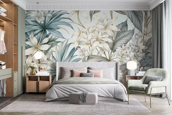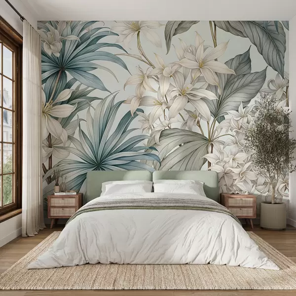 Murais de parede Uma estampa floral tropical com grandes flores brancas e azuis claras, folhas verdes e um fundo neutro Nr. w08318