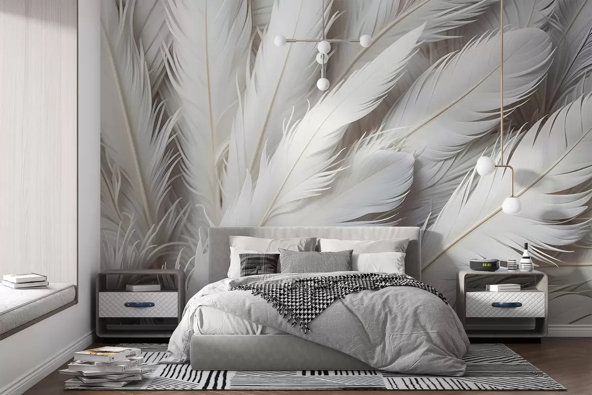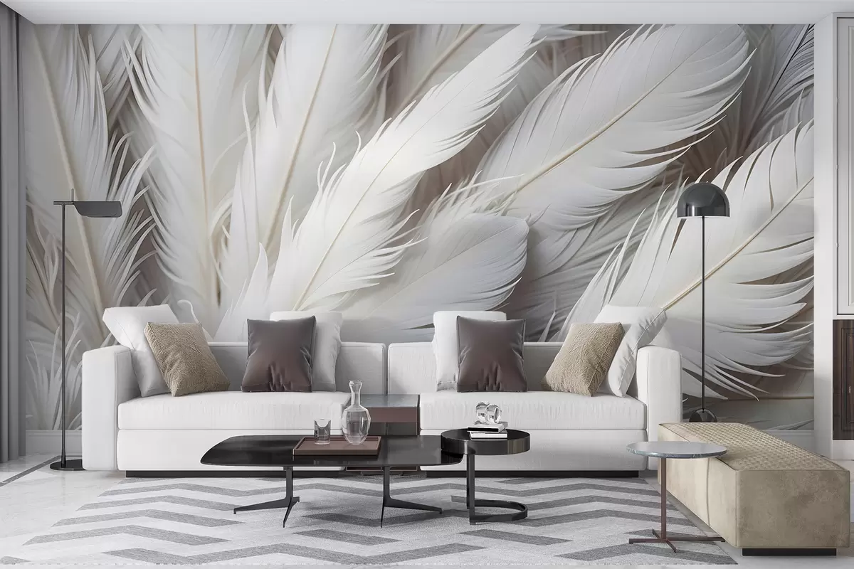 Murais de parede Penas brancas macias e fofas com uma textura delicada e fina em um fundo claro Nr. w08319