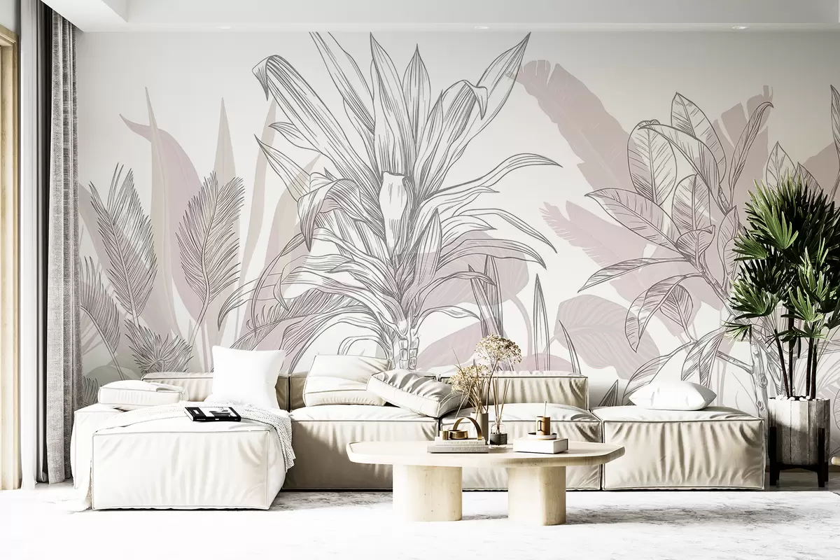 Murais de parede Plantas gráficas tropicais com folhas grandes e exuberantes e flores em tons de cinza e branco com silhuetas florais rosa Nr. w08327v1