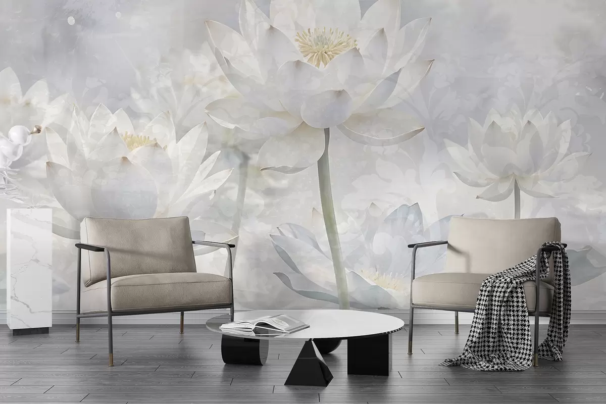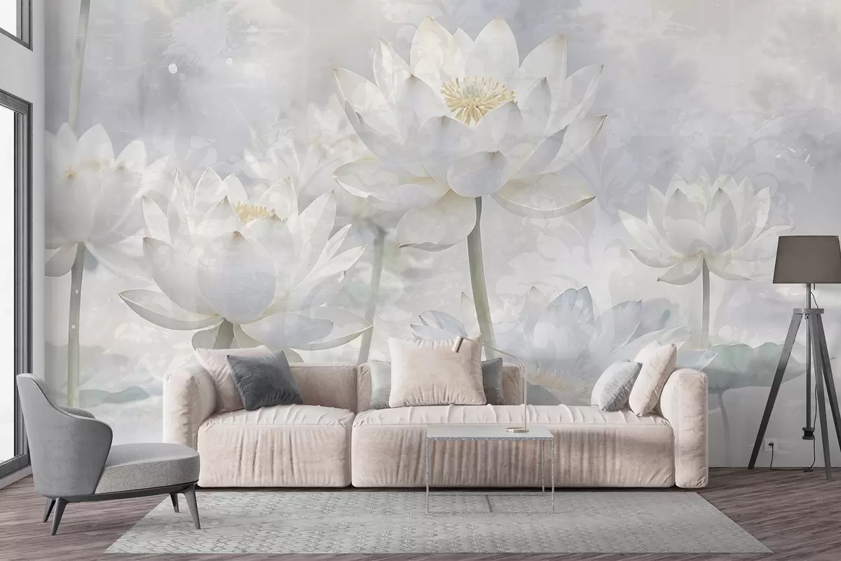 Murais de parede Flores de lótus brancas em um fundo de paisagem pastel abstrata etérea e enevoada Nr. w08328