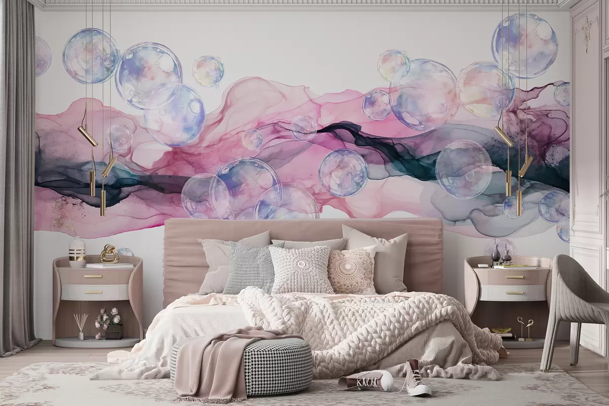 Murais de parede Formas fluidas abstratas coloridas com bolhas, redemoinhos de tons de rosa, azul e roxo em um fundo branco Nr. w08337