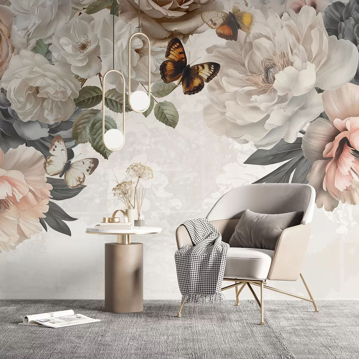 Murais de parede Grandes flores de peônia branca e rosa com uma borboleta pousada em uma das flores em um fundo suave e desfocado Nr. w08340