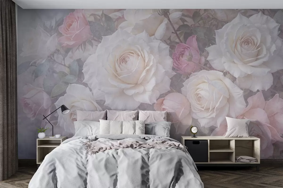 Murais de parede Rosas e peônias suaves, em tons pastéis, contra um fundo texturizado cinza enevoado e desfocado Nr. w08352
