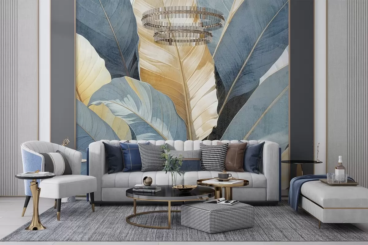 murais de parede Uma visão de perto de grandes folhas tropicais decorativas, exuberantes e texturizadas, em tons de azul, verde e amarelo w08373