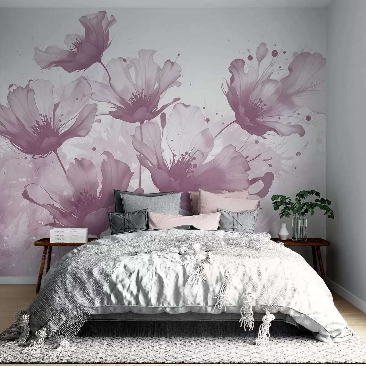 Murais de parede Delicadas flores cor-de-rosa com pétalas suaves e borradas e salpicos de aquarela em um fundo claro Nr. w08376v2