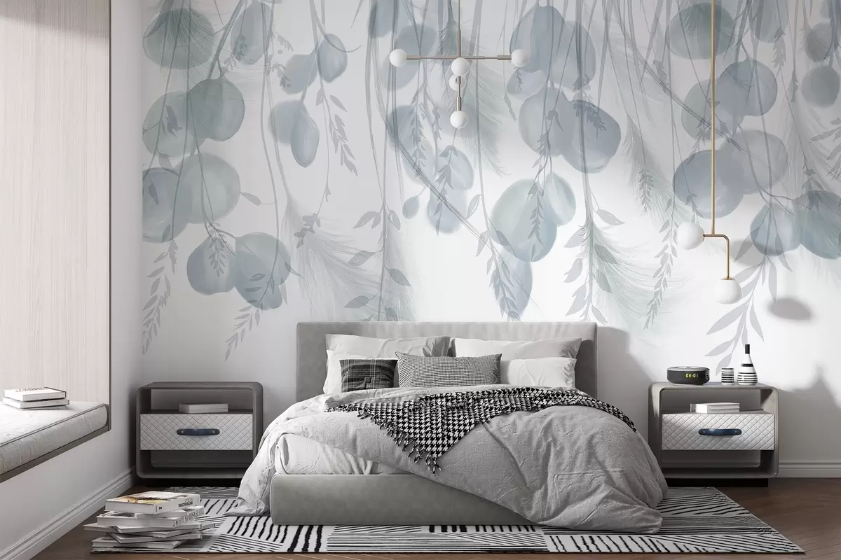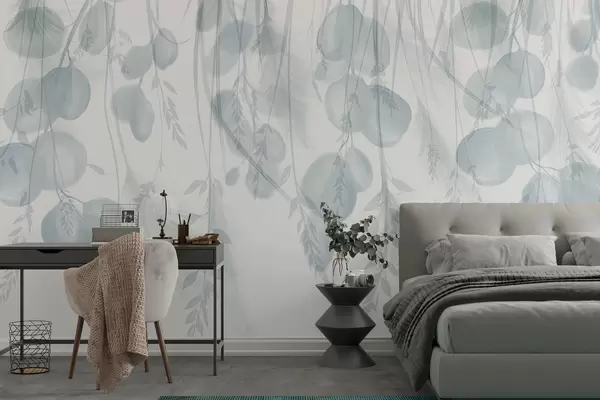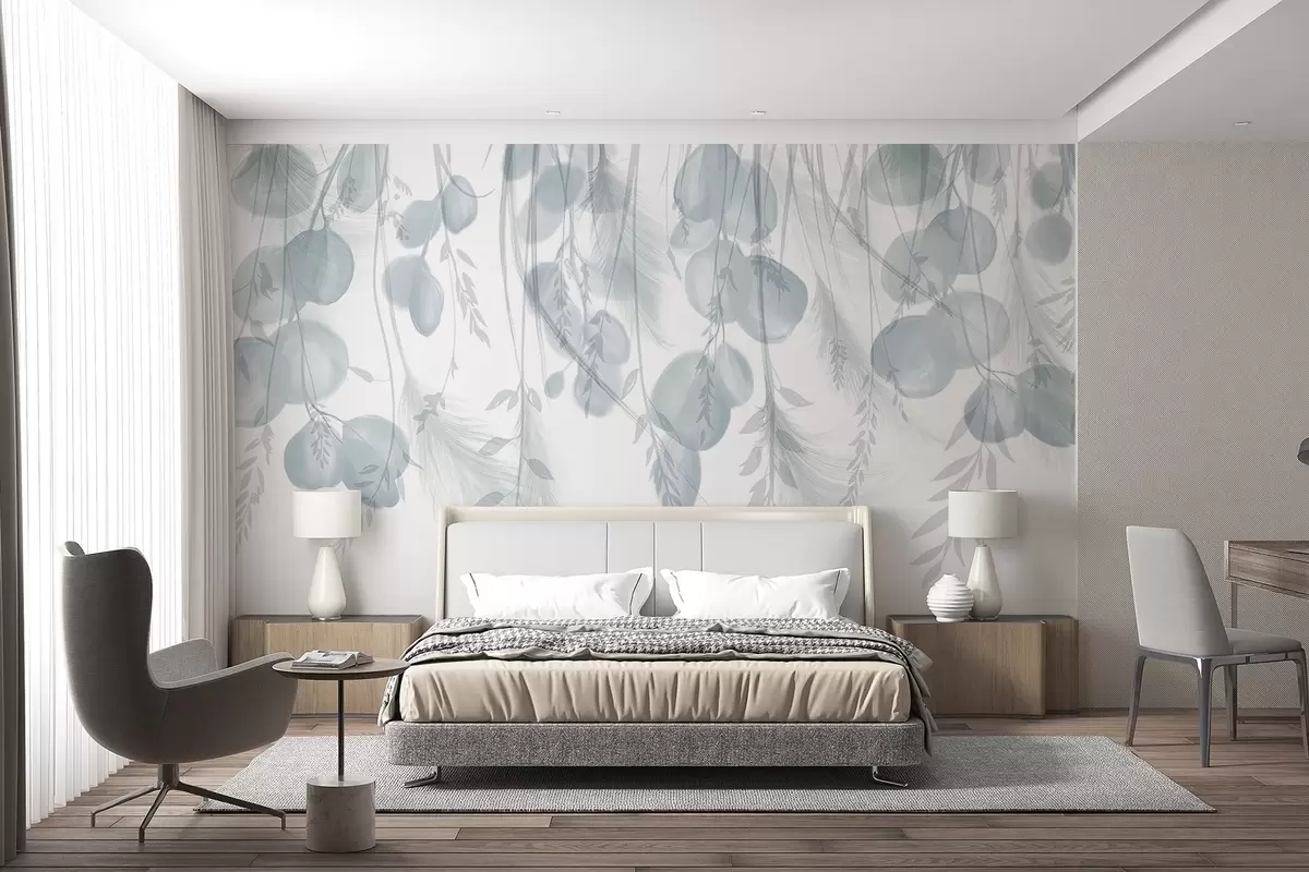 Murais de parede Delicadas folhas de eucalipto cinza e verde pastel caindo, criando uma atmosfera serena e calma Nr. w08380