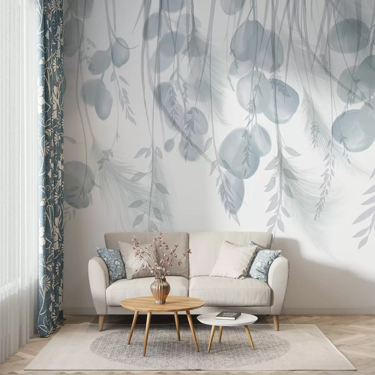Murais de parede Delicadas folhas de eucalipto cinza e verde pastel caindo, criando uma atmosfera serena e calma Nr. w08380