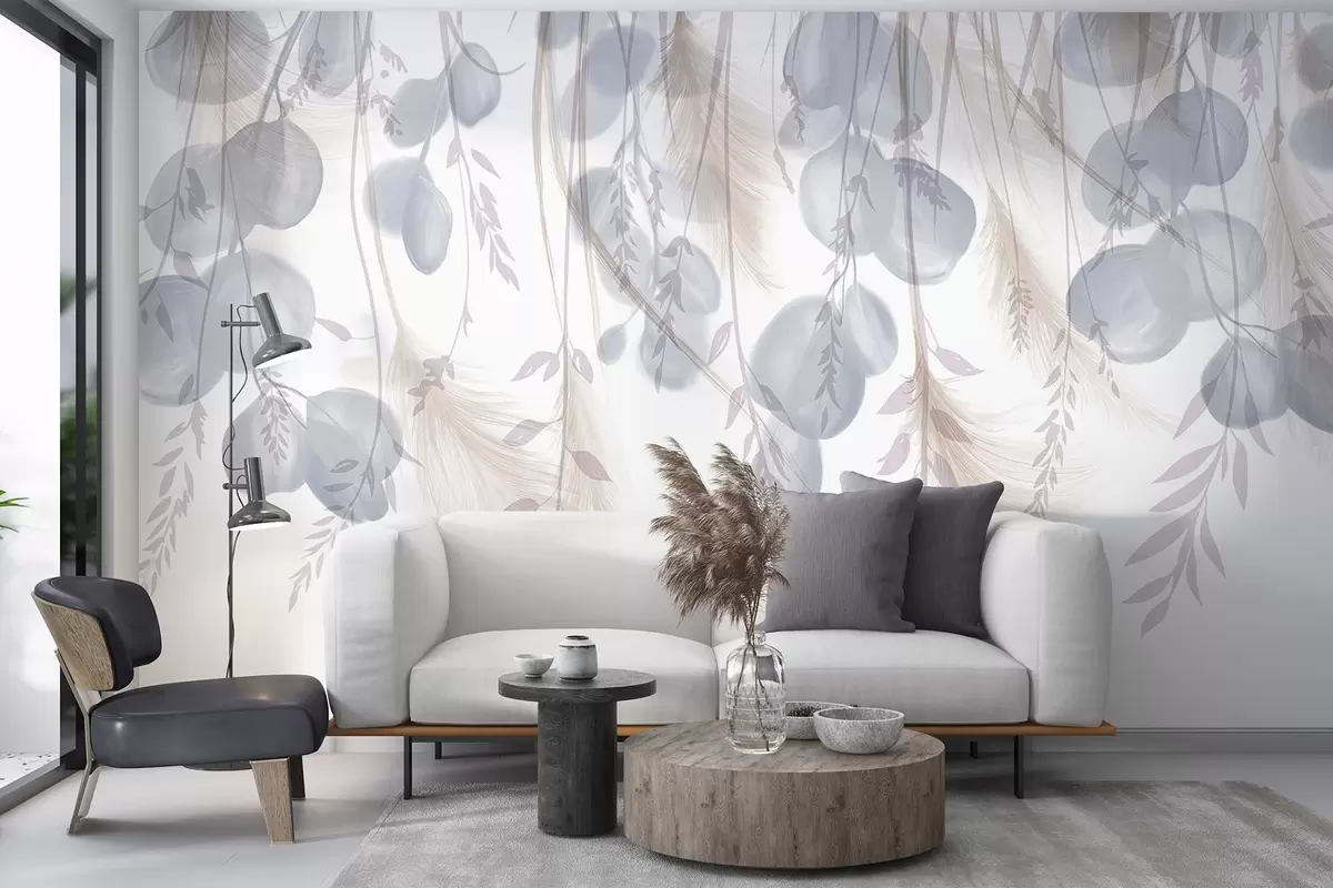 Murais de parede Delicadas folhas de eucalipto em azul e bege pastel caindo, criando uma atmosfera serena e calma Nr. w08380v1