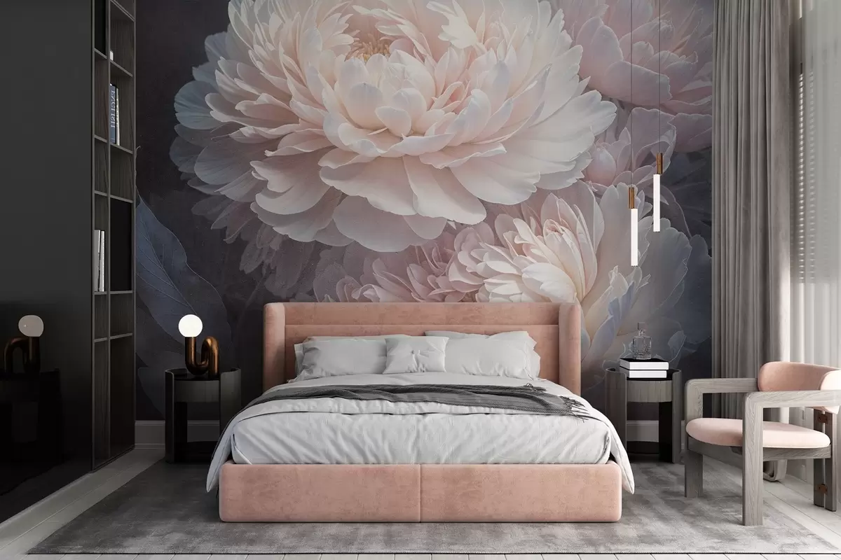 murais de parede Um close-up de duas grandes e delicadas peônias cor-de-rosa com pétalas e folhas macias e fofas contra um fundo desfocado w08382