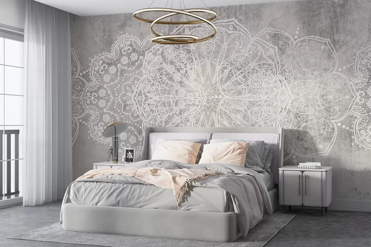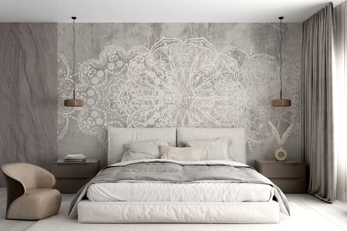 Murais de parede Um padrão detalhado e intrincado de mandala de renda branca em um fundo de parede cinza texturizado Nr. w08387
