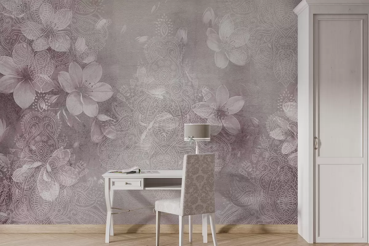 murais de parede Desenho com foco suave de delicadas flores brancas em um fundo borrado e texturizado com bordas de renda w08405v2