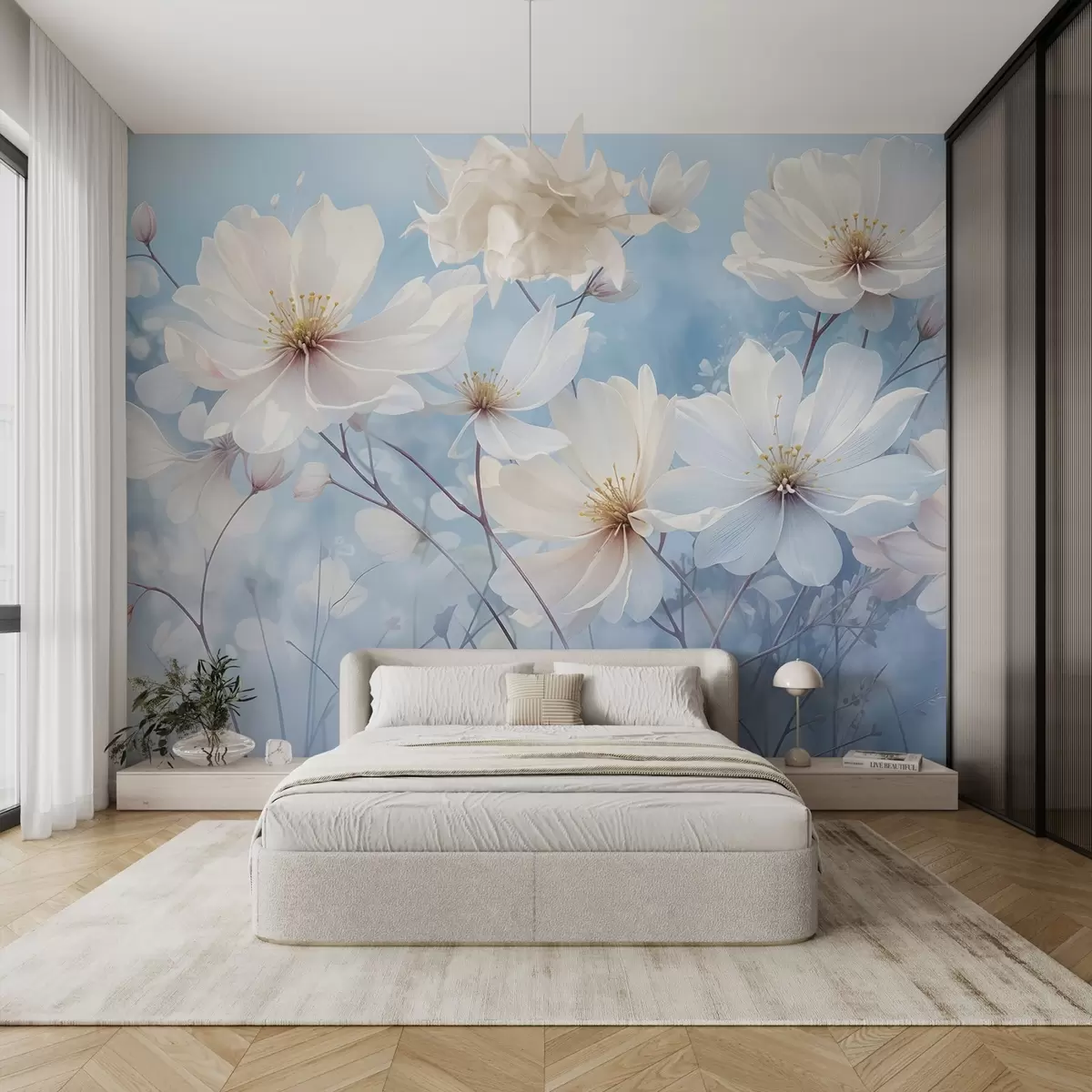 Murais de parede Delicadas flores brancas com pétalas macias em um fundo azul desfocado, criando uma atmosfera serena e etérea Nr. w08412