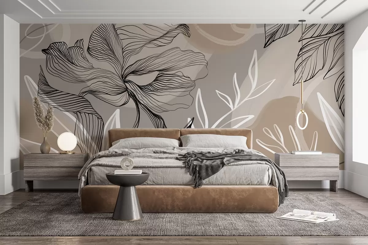 Murais de parede Estampa floral elegante com grandes flores e folhas de linhas abstratas em tons de cinza e bege em um fundo claro Nr. w08413