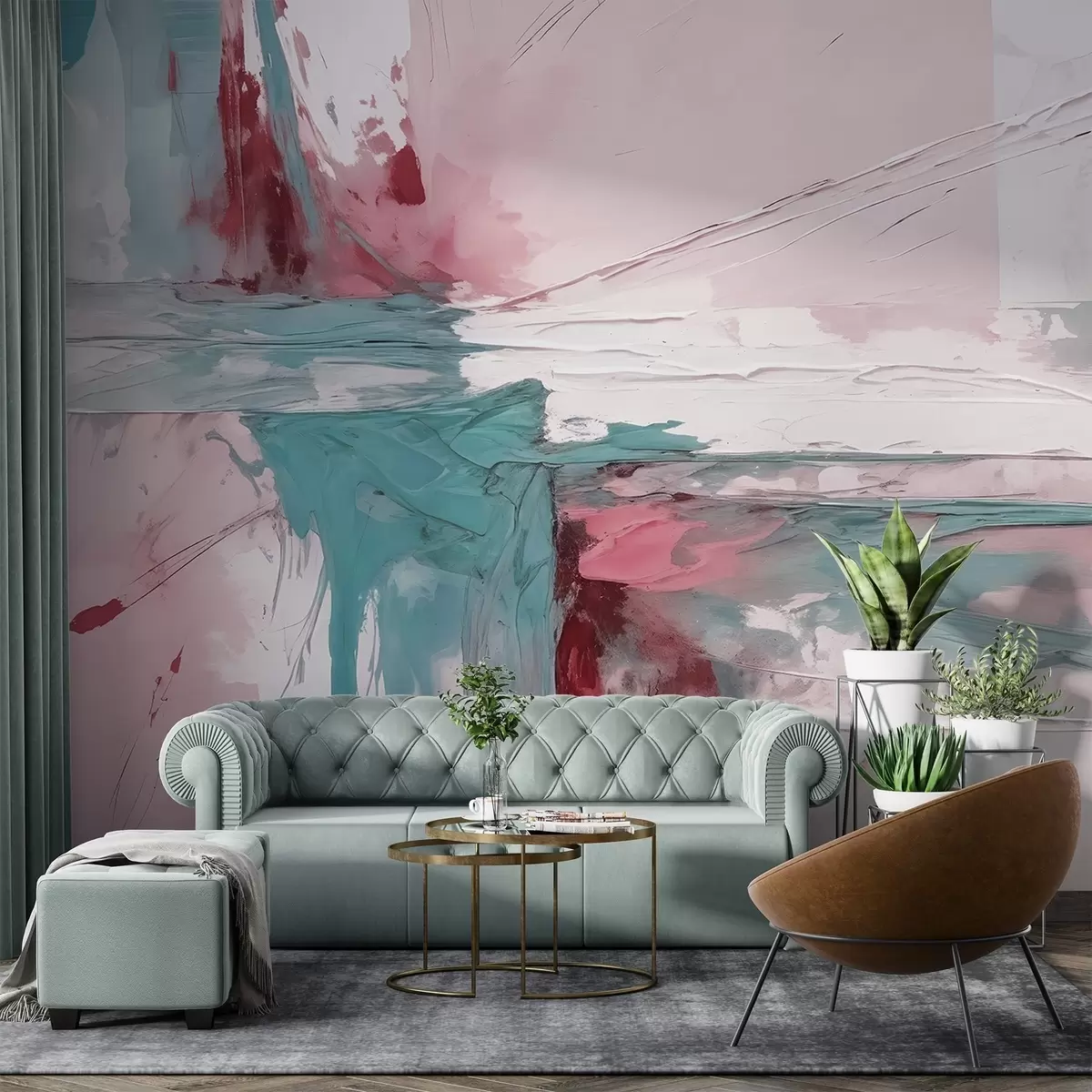 Murais de parede Composição de arte abstrata minimalista com pinceladas ousadas de tinta rosa, azul e branca Nr. w08414v1
