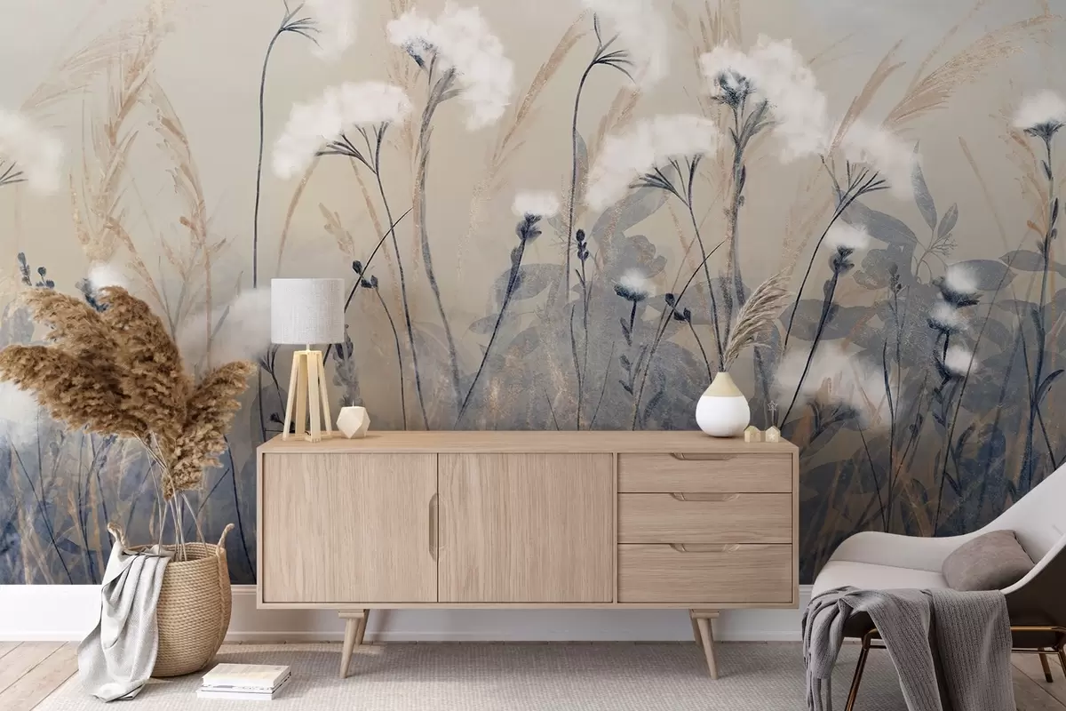 Murais de parede Grama branca e fofa de algodão contra um fundo texturizado desfocado, com uma atmosfera suave, nebulosa e serena Nr. w08416
