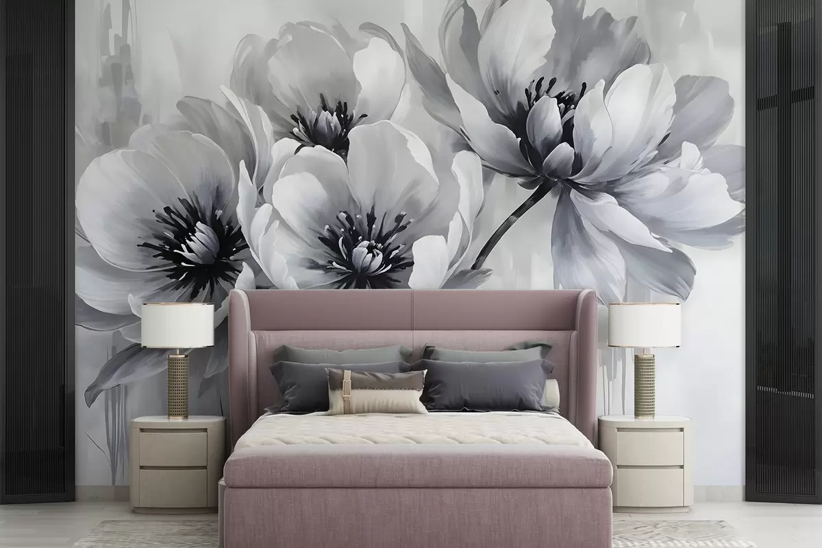 Murais de parede Flores de tulipa monocromáticas com pétalas suaves e desfocadas em um fundo claro Nr. w08418