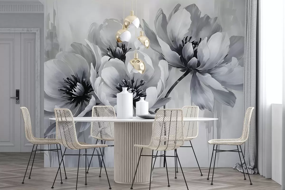 murais de parede Flores de tulipa monocromáticas com pétalas suaves e desfocadas em um fundo claro w08418