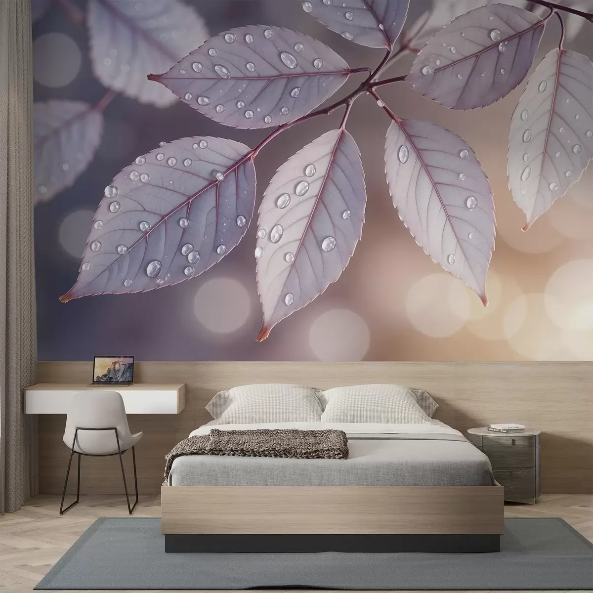 Murais de parede Delicadas folhas roxas com gotas de água, fundo com foco suave Nr. w08419