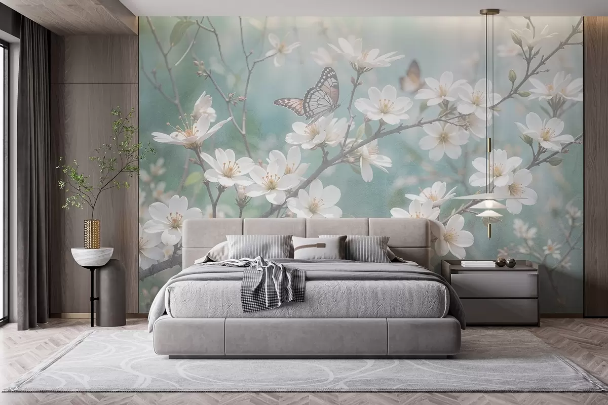 Murais de parede Uma borboleta branca em um galho com delicadas flores de cerejeira brancas em primeiro plano contra um fundo desfocado Nr. w08421