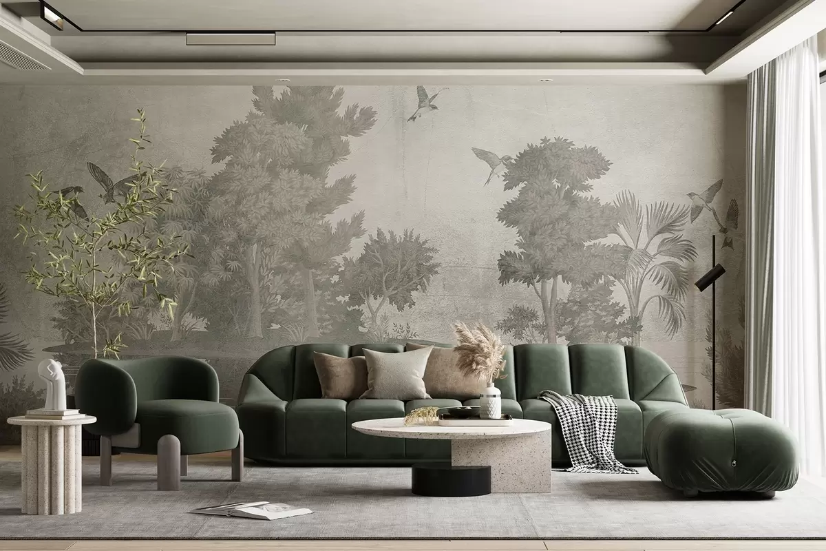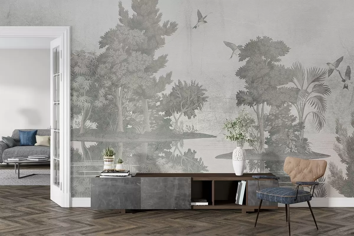 Murais de parede Uma impressão de paisagem florestal com um lago cercado por pinheiros e outras folhagens em um fundo verde texturizado Nr. w08426v1