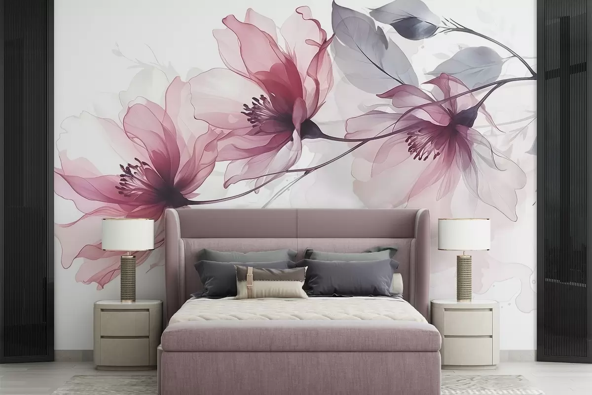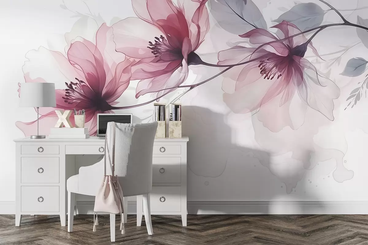 murais de parede Delicadas flores transparentes em rosa e cinza com pétalas suaves e desfocadas em um fundo branco w08429