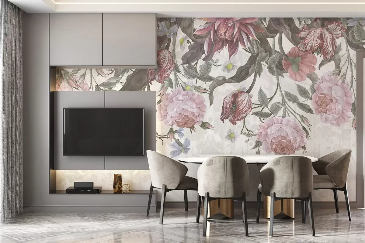 Murais de parede Um arranjo floral exuberante com grandes flores rosas e brancas, com folhas e caules verdes Nr. w08435