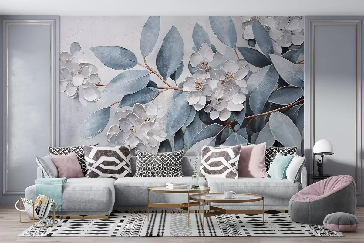 Murais de parede Delicadas flores brancas com folhas verde-acinzentadas em um fundo suave e sem som no estilo de pintura a óleo Nr. w08437