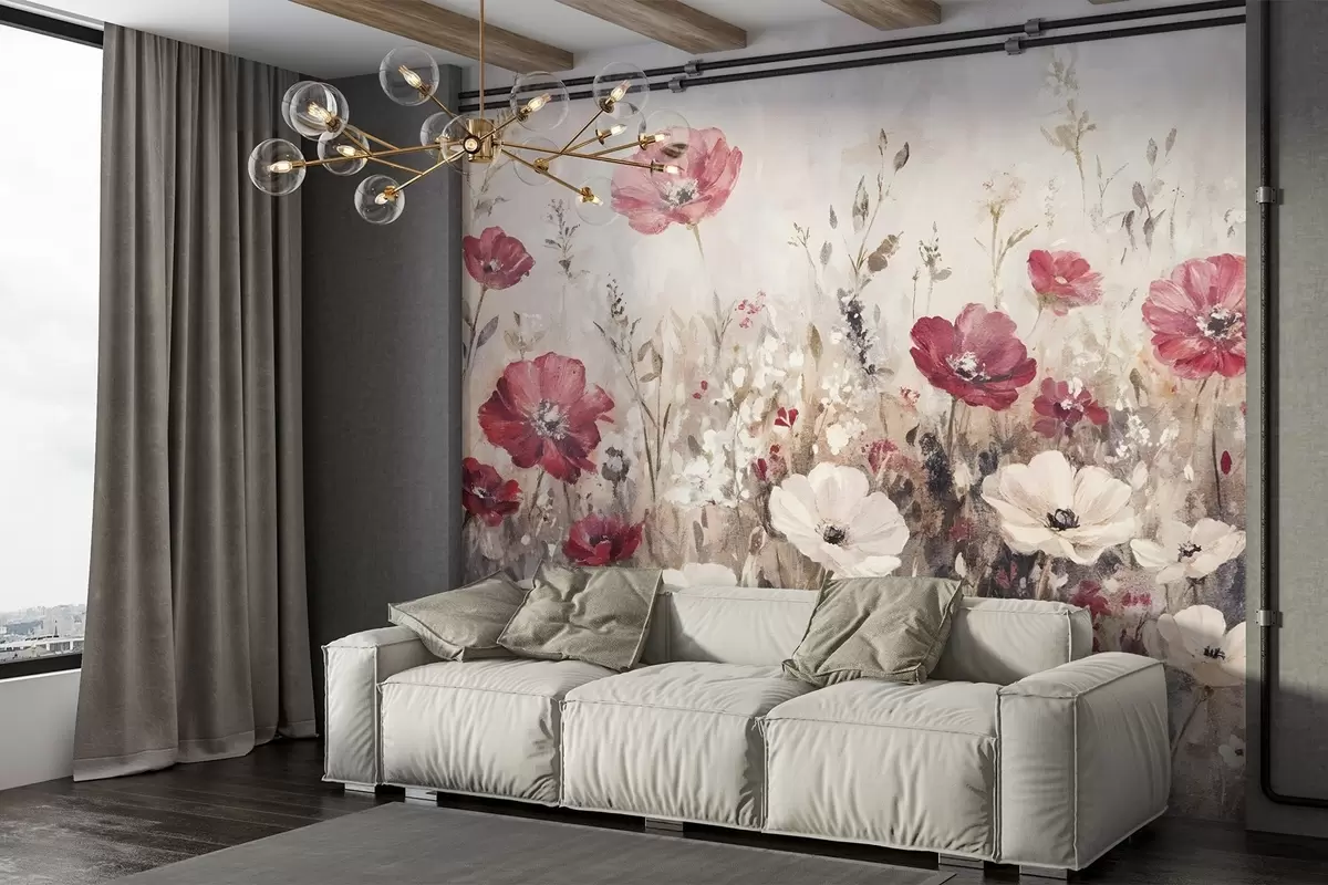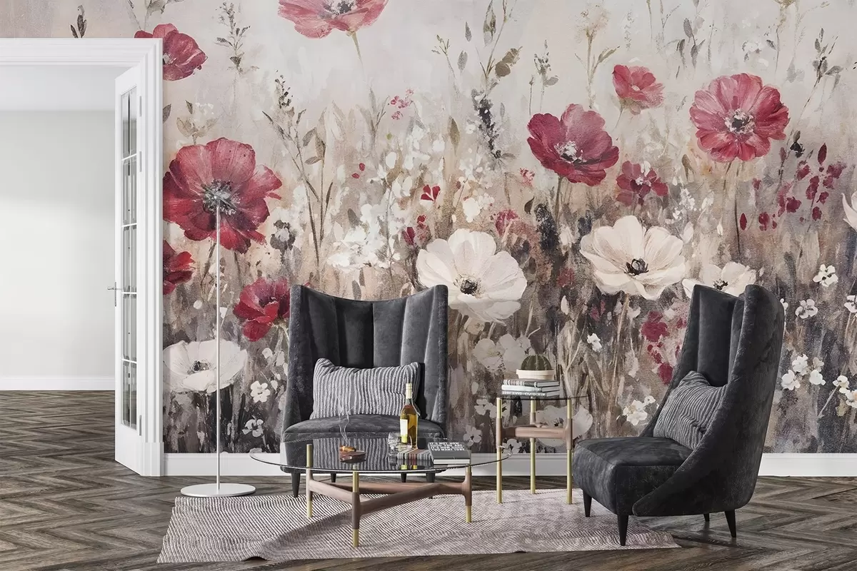 Murais de parede Um campo de flores vermelhas e brancas vibrantes contra um fundo suave e nebuloso em estilo de pintura a óleo Nr. w08438
