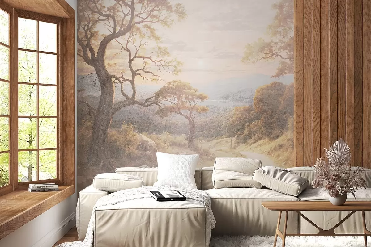Murais de parede Um caminho de terra sinuoso em uma floresta exuberante de outono, com árvores altas e retorcidas e luz solar quente Nr. w08446