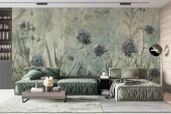 Murais de parede Um campo de flores de cardo roxo com flores e folhagens borradas em um fundo de textura vintage Nr. w08463