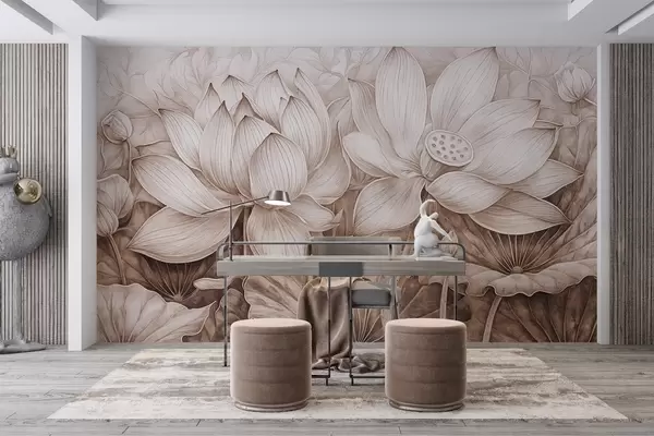 murais de parede Várias flores de lótus bege grandes, com textura detalhada, folhas e caules marrons contra um fundo claro w08465v1