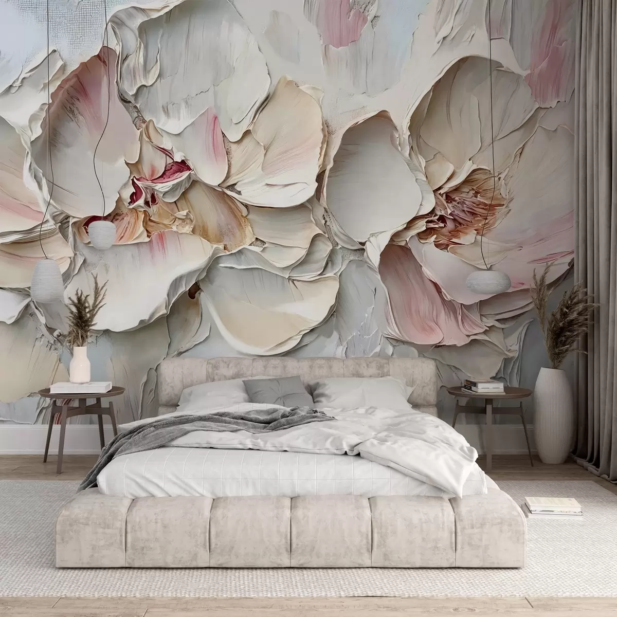 Murais de parede Flores delicadas, rosa pálido, com pétalas suaves e em camadas em um fundo suave e texturizado, imitação de pintura a óleo impasto Nr. w08467