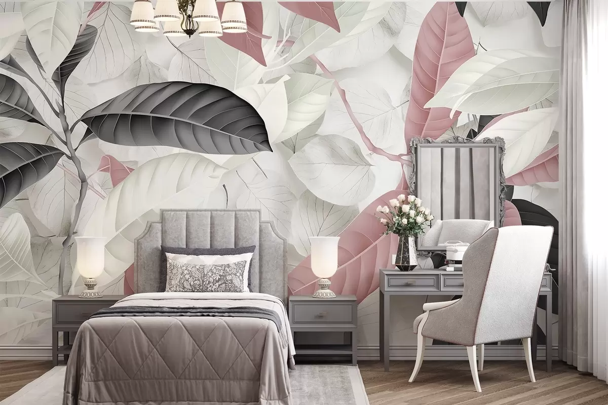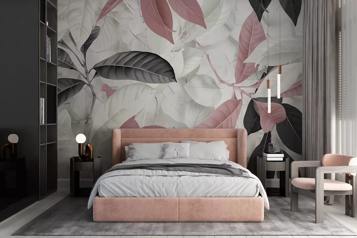 Murais de parede Impressão grande de folhas rosa e cinza em um fundo texturizado de folhas claras, criando uma sensação tropical exuberante Nr. w08468