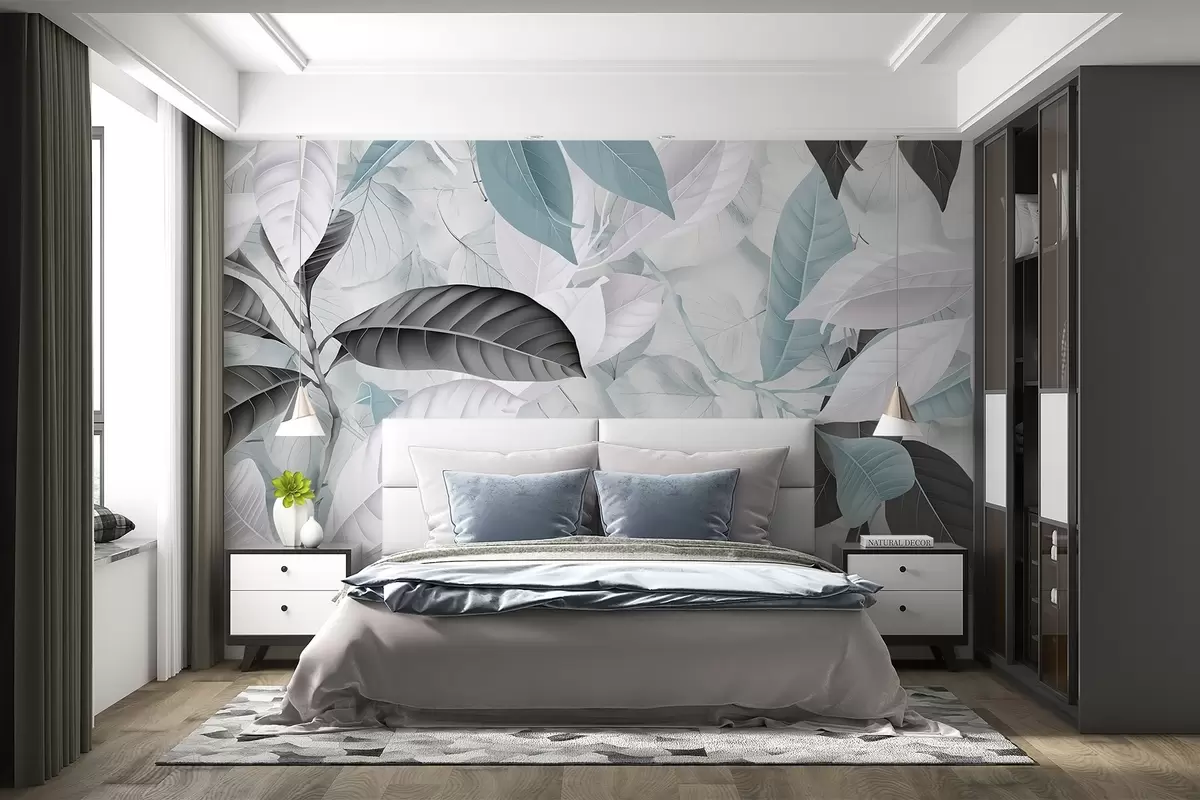 Murais de parede Impressão grande de folhas azuis e cinzas em um fundo texturizado de folhas claras, criando uma sensação tropical exuberante Nr. w08468v1