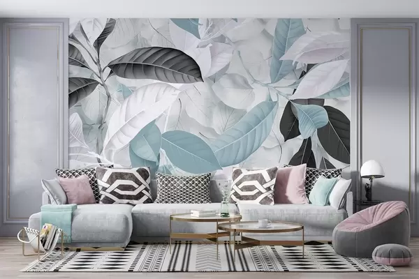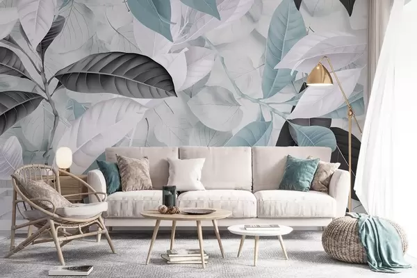 Murais de parede Impressão grande de folhas azuis e cinzas em um fundo texturizado de folhas claras, criando uma sensação tropical exuberante Nr. w08468v1