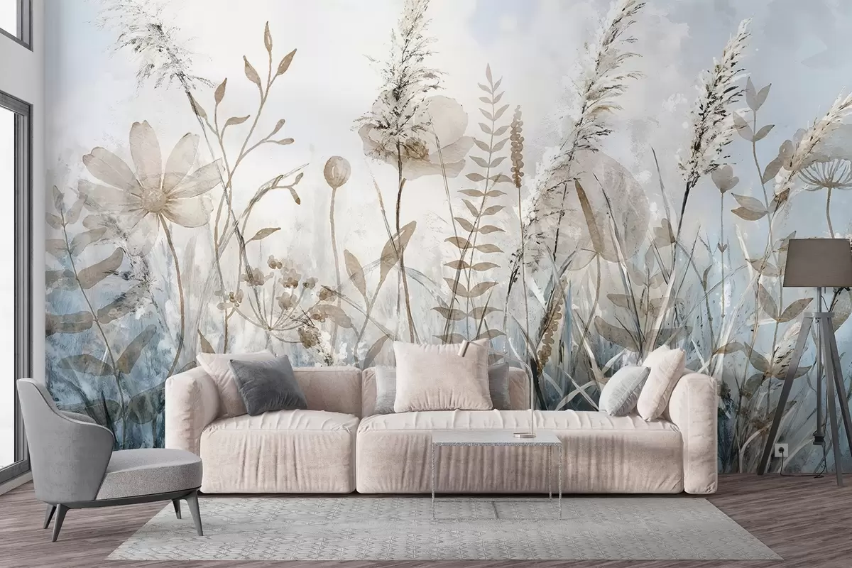 Murais de parede Um campo de grama alta, folhagem natural e plantas com texturas suaves e finas contra um céu enevoado e nublado Nr. w08472