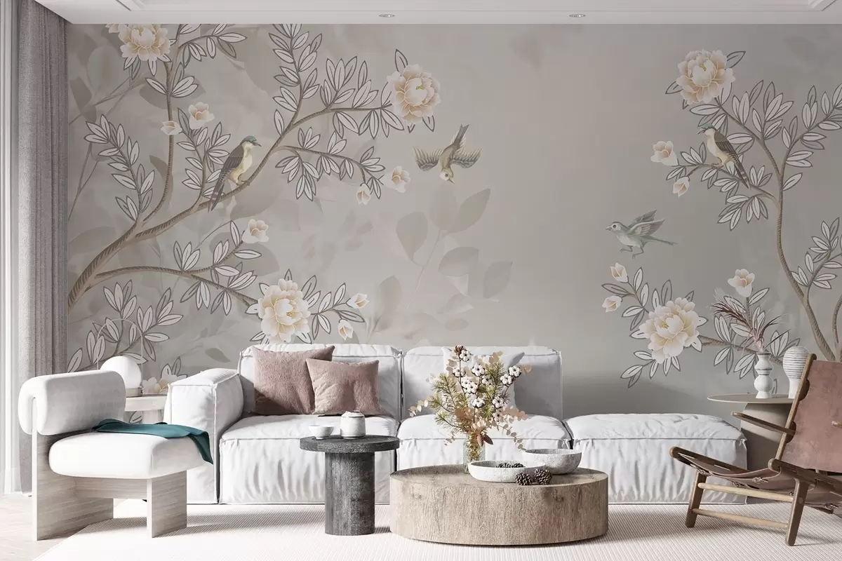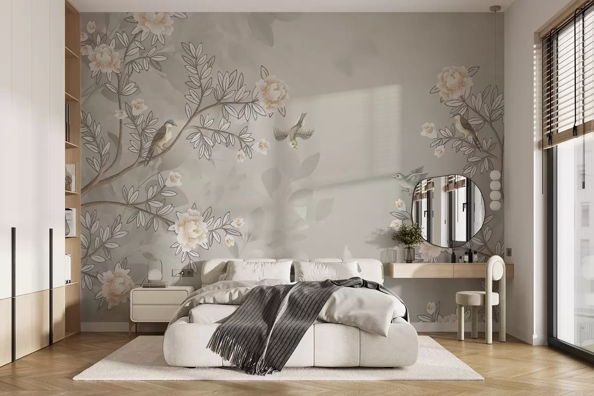 Murais de parede Galhos com rosas e pássaros voando em tons claros Nr. w08493