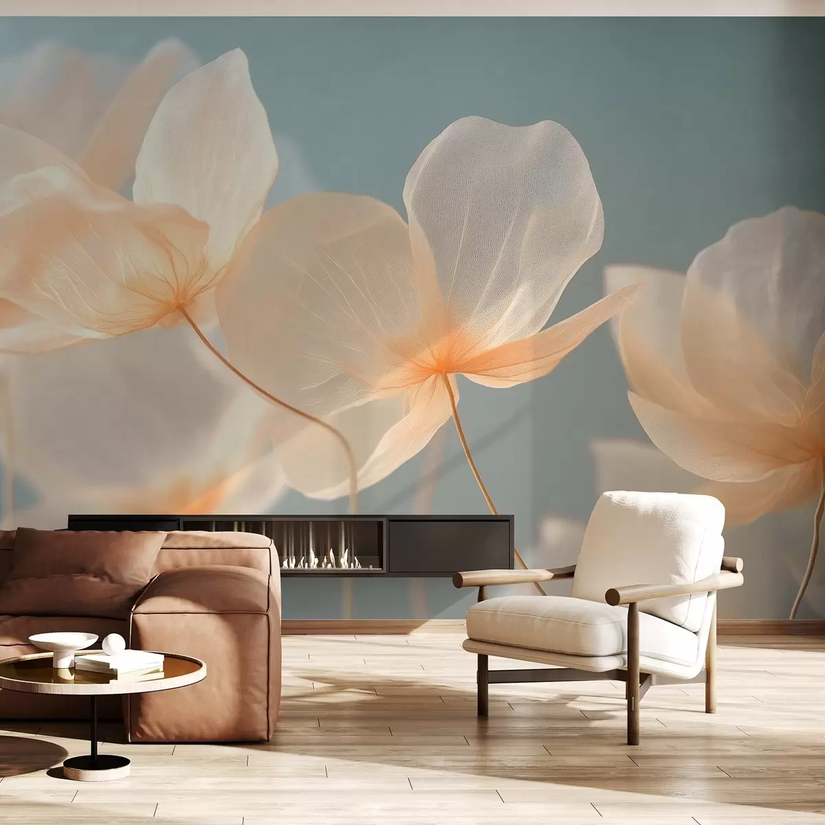 Murais de parede Pétalas de lótus, uma composição delicada com um fundo azul Nr. w08500
