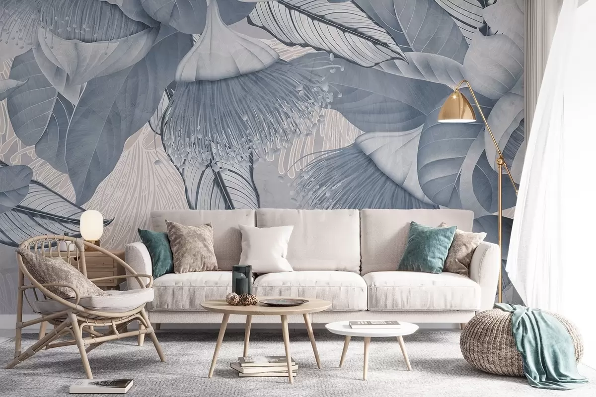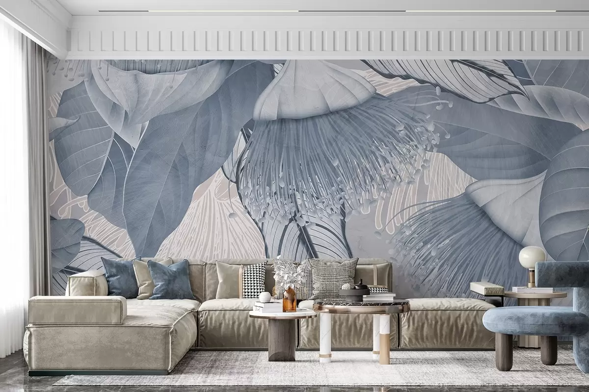 Murais de parede Ilustração botânica de grandes flores azuis de eucalipto com estames longos em um fundo cinza e branco Nr. w08539v1