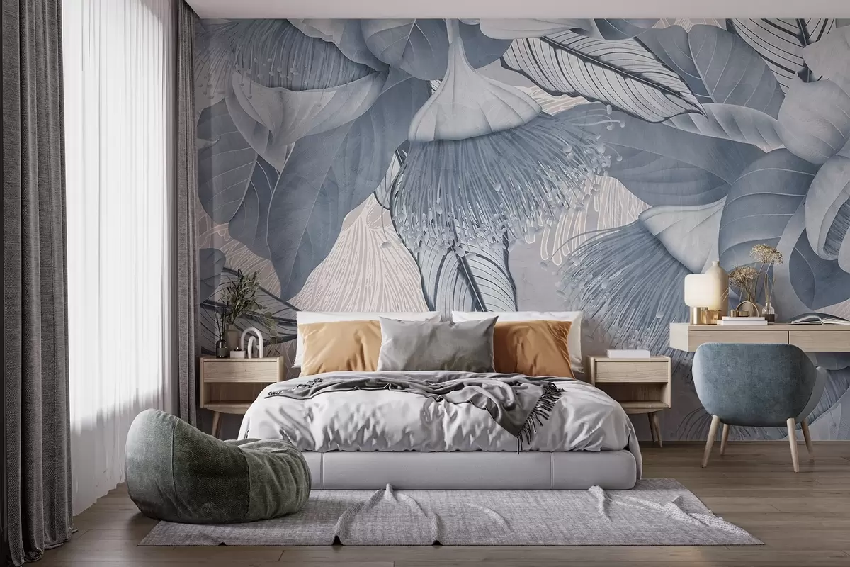 Murais de parede Ilustração botânica de grandes flores azuis de eucalipto com estames longos em um fundo cinza e branco Nr. w08539v1