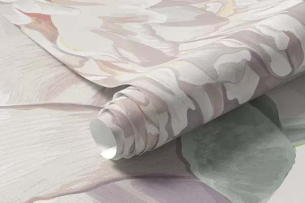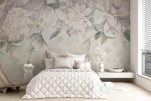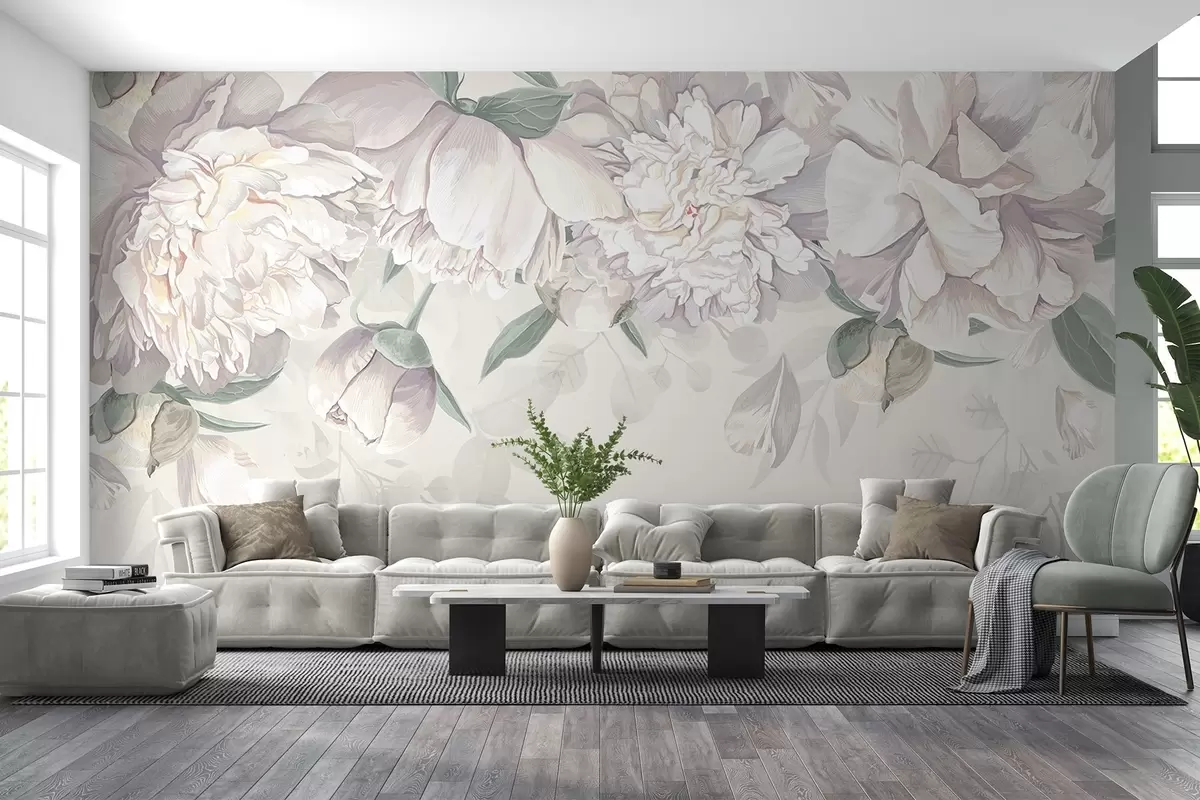 Murais de parede Delicadas peônias em tons pastéis de branco e rosa com folhas verdes, dispostas em um fundo floral suave e romântico Nr. w08577