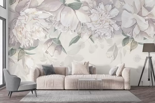 Murais de parede Delicadas peônias em tons pastéis de branco e rosa com folhas verdes, dispostas em um fundo floral suave e romântico Nr. w08577