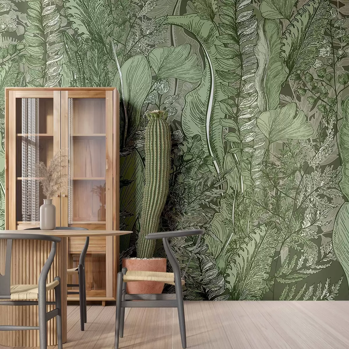 Murais de parede Uma floresta exuberante e verdejante com vários tipos de samambaias, folhas e folhagens em tons de verde Nr. w08579