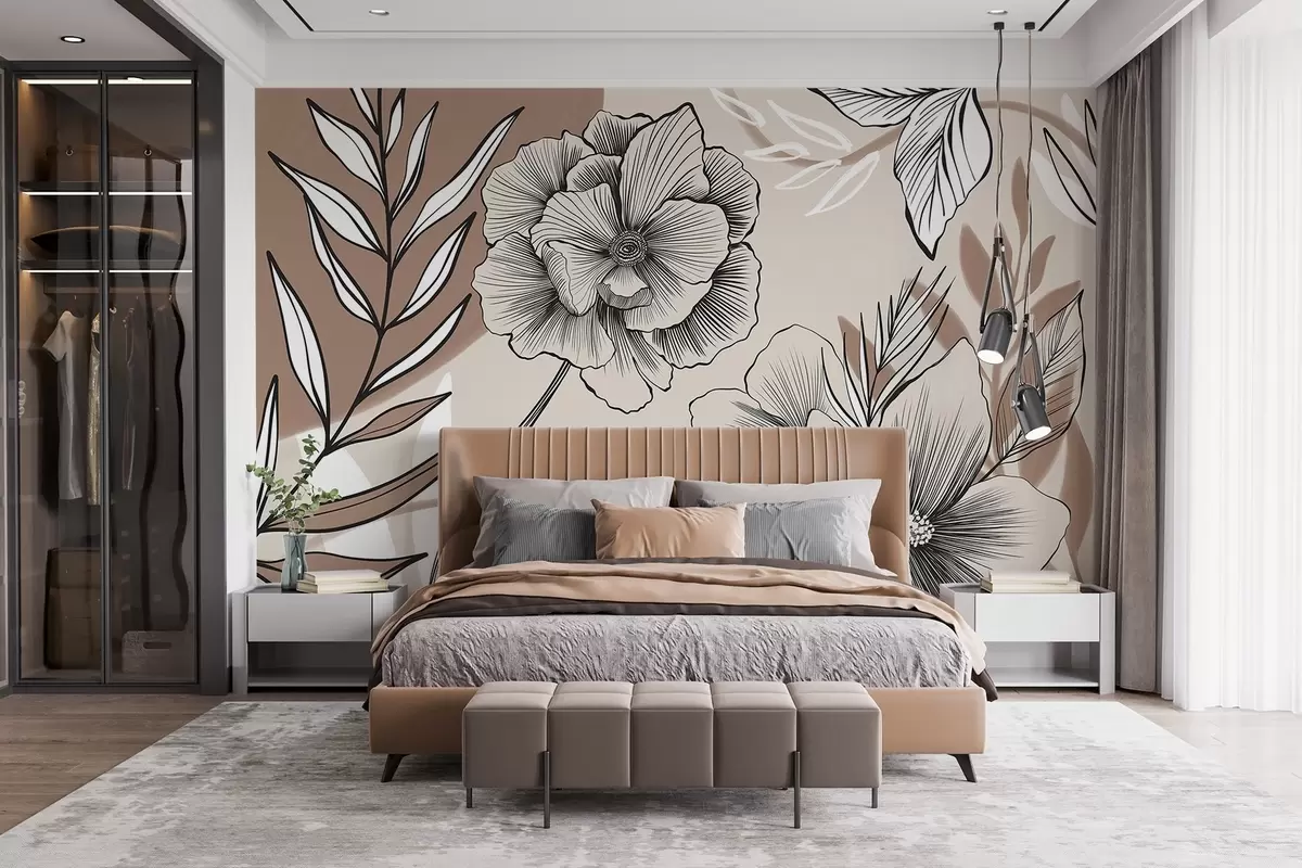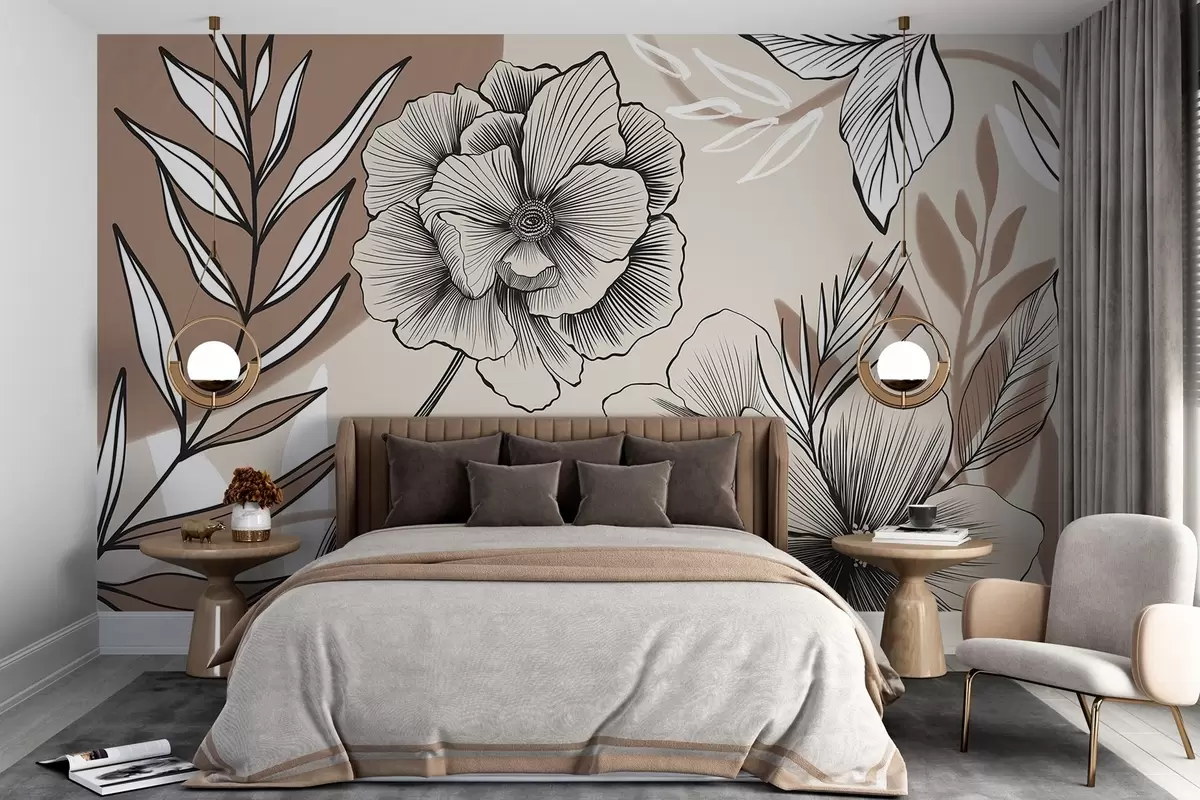 Murais de parede Grandes flores gráficas em preto e branco com folhas detalhadas em um fundo abstrato bege Nr. w08580