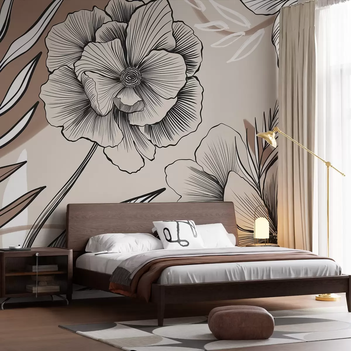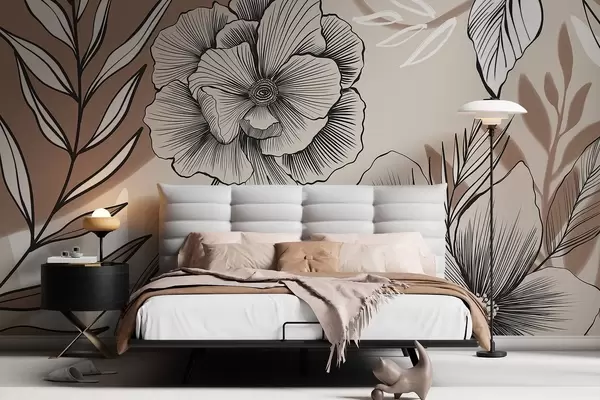 Murais de parede Grandes flores gráficas em preto e branco com folhas detalhadas em um fundo abstrato bege Nr. w08580