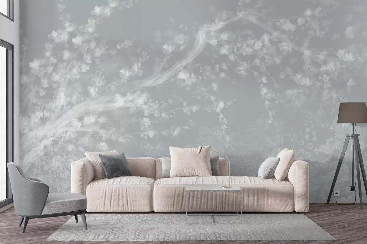 Murais de parede Impressão desfocada e fora de foco com galhos de árvore brancos e nebulosos com fundo floral de luz suave Nr. w08581